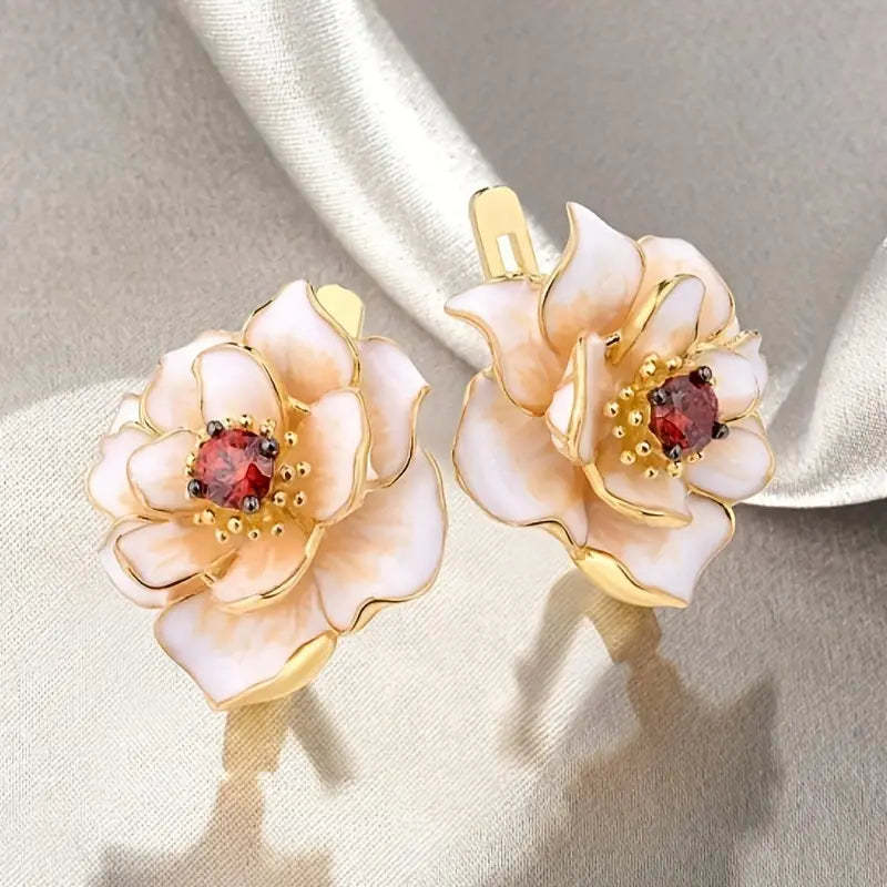 Vintage White Enamel Blossom Gold Earrings